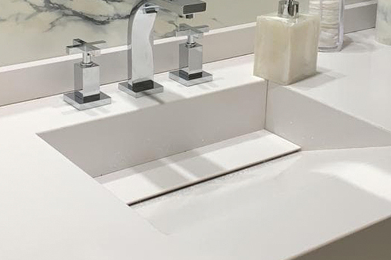 Superficio de cuarzo premium con caracteristicas unicas, alta resistencia a machans y rayas, facil de limpiar e instalar. Superficie apta para mesada de baño y cocina.